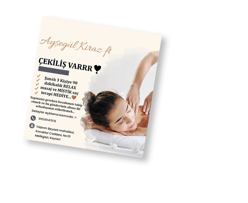 Uzun yıllardır sağlık ve güzellik alanında çalışan ve bu alanda uzmanlaşmış bir profesyonelim. Kayseri'de bulunan Ayşegül Kiraz FT Merkezi'nde, fizyoterapi, fitoterapi, kayropraktik, manuel terapi, masaj ve terapi hizmetleri sunarak insanların sağlıklı ve mutlu bir yaşam sürmelerine yardımcı oluyorum.